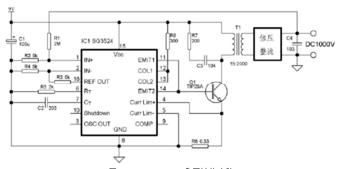 流電壓變換器(DC-DC變換器)是將電池電壓轉換為直流高壓測試電壓,它是數字式兆歐表關鍵部分,常見有250V、500V、1000V三種測試電壓(也有2500V、5000V等較高測試電壓)。由于考慮轉換效率、體積、輸出電壓控制及變換,數字兆歐表經常采用脈寬調制(PWM)型開關電源集成控制器將電池的直流電壓變換為脈寬調制信號,經升壓變壓器轉化為高壓脈沖,由倍壓整流(二倍或三倍)平滑成直流高壓測試電壓,其輸出電壓大小是通過輸出電壓控制電路調節脈沖寬度來實現的。常見使用UC3840、TL494、SG3524等,這類脈寬調制型控制器是國際上最為流行的開關電源集成控制器,它包括開關穩壓器所需的全部控制電路,其中有誤差放大器、振蕩器、脈寬調制器、脈沖發生器、開關管、過流過熱保護。圖2是應用SG3524將9V直流電升壓至1000V的實用電路。