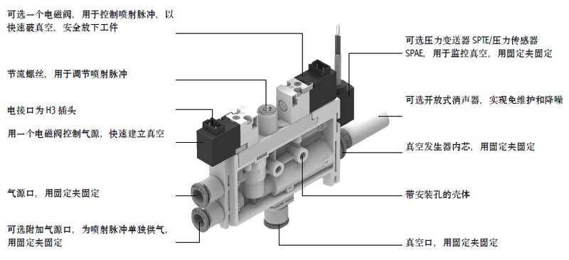 集成電磁閥,所以開關(guān)時(shí)間短– 真空開/關(guān)– 噴射脈沖