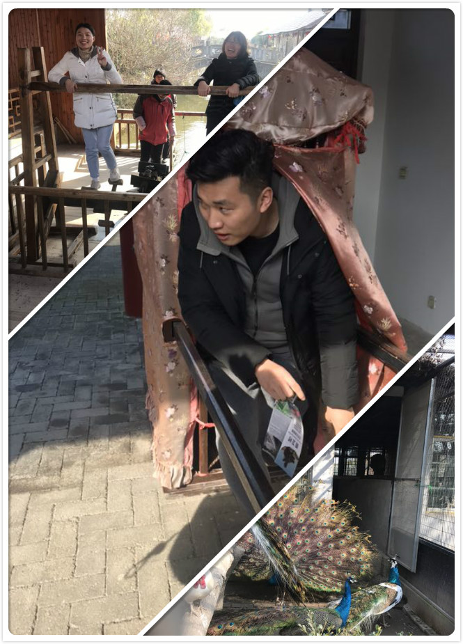 崇明生態村中的復原水車、古老的轎子、孔雀開屏