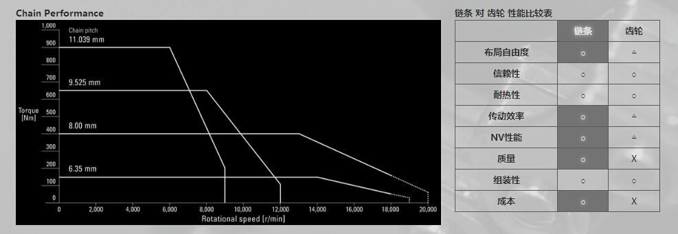 Enedrive Chain以效率和性能的最優(yōu)化為目標(biāo)的技術(shù)革新,充分利用在四輪驅(qū)動車分動箱所采用的鏈條的開發(fā)過程中積累的技術(shù)和經(jīng)驗,提供了在齒輪中無法實現(xiàn)的輕量、低噪音、低成本的系統(tǒng)。