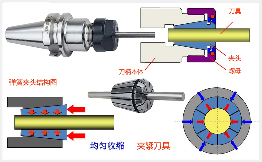 ETP彈簧夾頭刀柄是用來裝置在銑床上的一種用來禁錮鉆頭或者是銑刀的一種筒形的夾具。彈簧夾頭刀柄工作原理結(jié)構(gòu)圖如下: