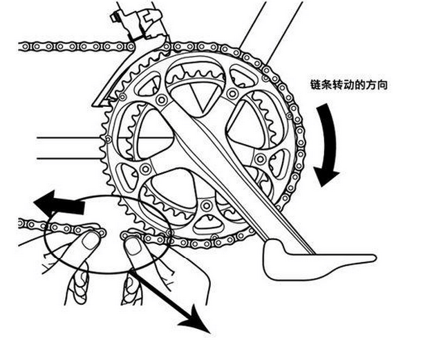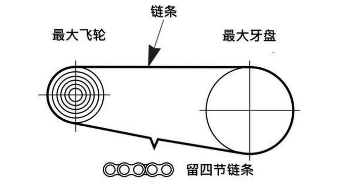 如上圖所示,鏈條不穿過后撥,過最大牙盤和最大飛輪,形成一個完整的圈之后,留出4節鏈條。雙片牙盤鏈條安裝:常見公路車牙盤,折疊車也有用公路牙盤的,山地車從2010年開始有雙盤設計。