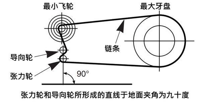 如上圖所示,鏈條穿過后撥,過最大牙盤和最小飛輪,形成一個完整的圈之后,張力輪和導向輪所形成的直線于地面交叉所形成的角度小于等于90度即可。這樣的鏈條長度為最佳鏈條長度。三片牙盤鏈條安裝:常見山地車牙盤,公路牙盤也有三片盤的設計。