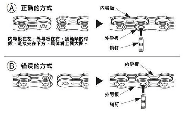 最后的準備鏈條安裝時候的一個小細節,這一點往往是被忽略的。就是安裝的時候內導板和外導板的方向,應該是在左邊還是在右邊。正確的安裝方向會讓你的鏈條強度更高。